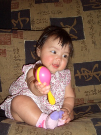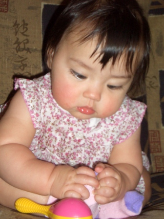 September 14: Back in Newton, Aurora enjoys her toys. She also (angrily) shows off her first tooth.