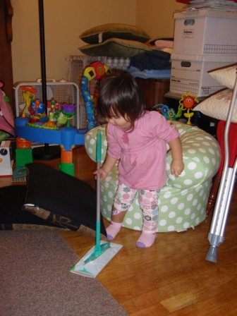 Aurora likes doing what we do, even if it is housework! Here she is Swiffering the living room (rug).