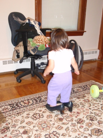 trying on our shoes and walking all over the house with them on. Here she is proving that women can do