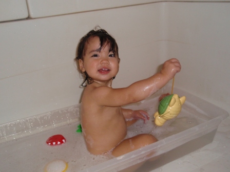 we were in Asia this summer, she had the opportunity to take her first baths in a tub - and she loved it,