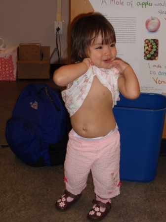Getting ready to go home...Aurora must check to make sure her belly button is still there. Aurora will often lift up