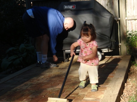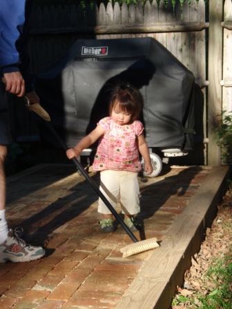 Aurora helped Baba finish the backyard patio project. She brushed more sand into the cracks between the bricks.