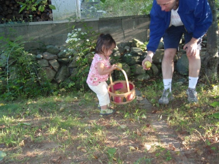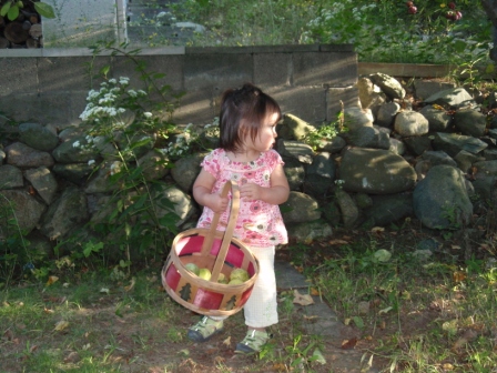 While Mama raked leaves, Aurora helped Baba pick apples from our trees.