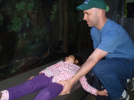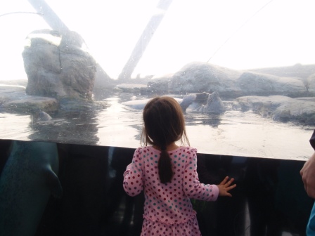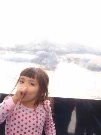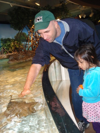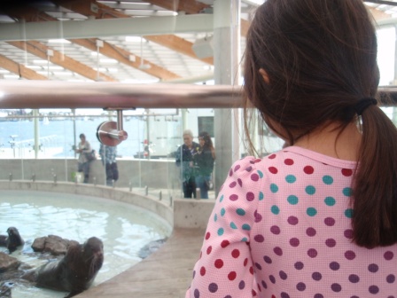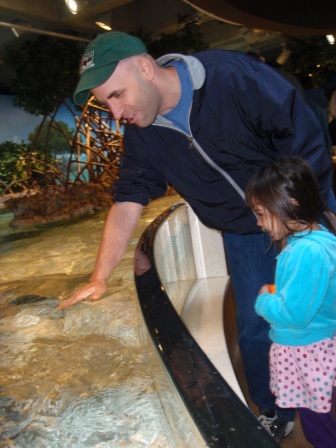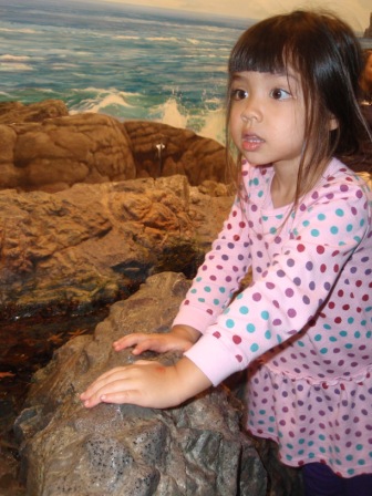 Aurora at the tidepool touch tank. This time she's willing to touch a seastar.