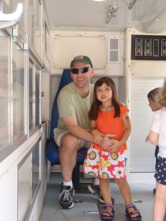 Checking out some of the town trucks. Aurora is worried that the horns will be too loud.
