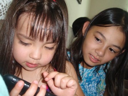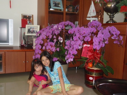 Dinner at Nai Nai's. Aurora and Wai Po play with an orchid that fell off one of the plants. Don't they look pretty?