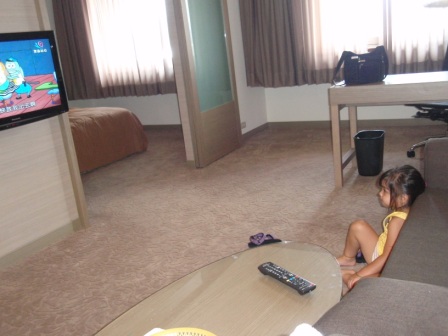 in the gym for a workout, then watched Sponge Bob Square Pants in Chinese while Kathy finished packing.