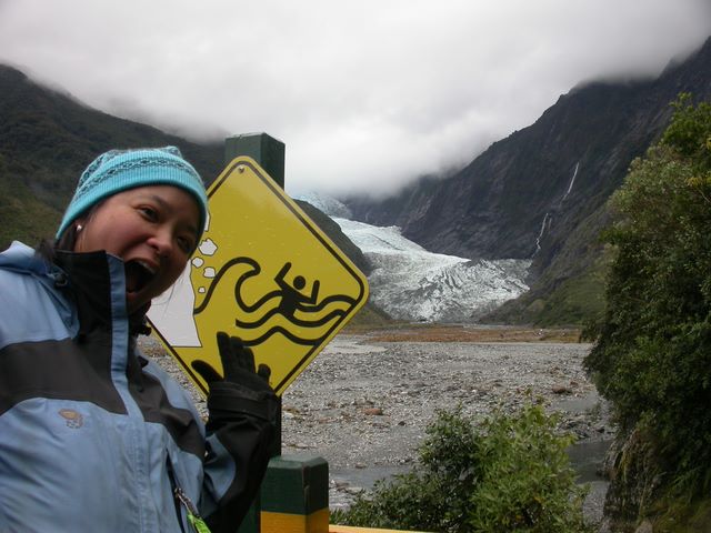 New Zealand -- We ignored this sign and climbed over a fence to get closer to the glacier.