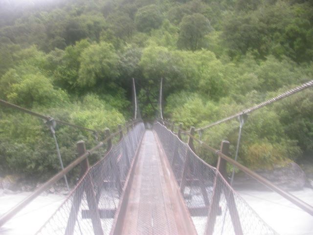 New Zealand -- The suspension bridge over the Fox Glacier's river.