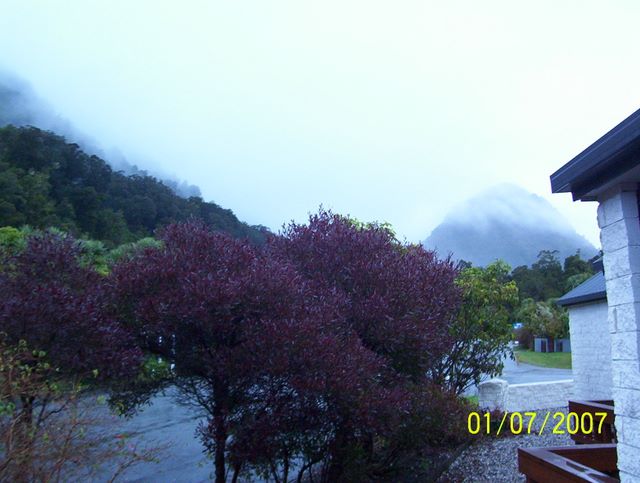 New Zealand -- The view from our room at the Alpine Motor Lodge. Somewhere in the mist are mountains.