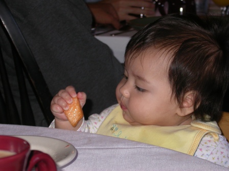 At dinner, Aunt Futing and Elena help take care of Aurora while her parents eat.