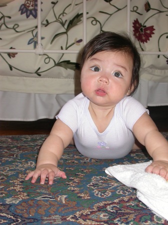 Aurora doing pushups as Kathy and Jon pack up to head home. She'll be crawling soon!