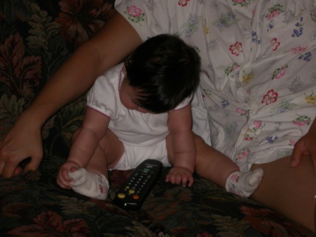 August 3: The girls are watching The Weather Channel in the morning...and then Aurora is trying to switch to something more interesting.