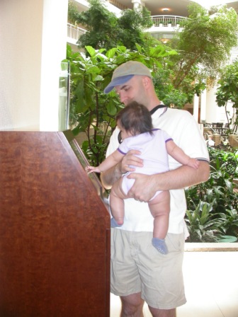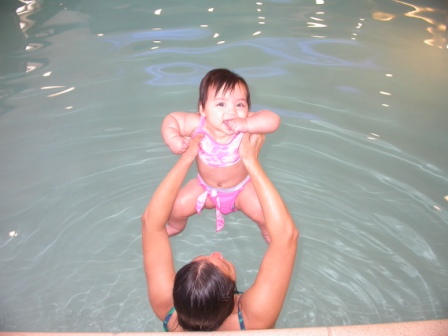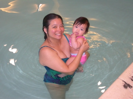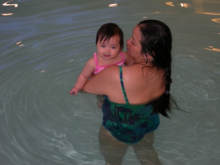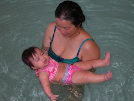 Trying out the hotel pool. At first Aurora was excited, but once she was in the cool water, she seemed to wonder what her parents were thinking!
