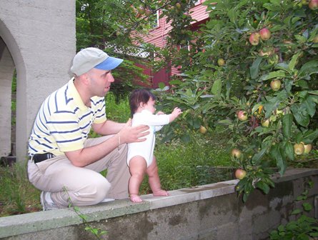 That evening, Aurora checks out the apples on one of the trees in the backyard. She loves to touch leaves and flowers!