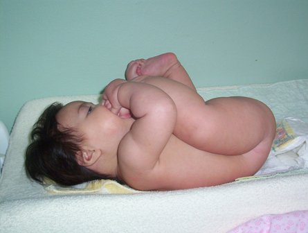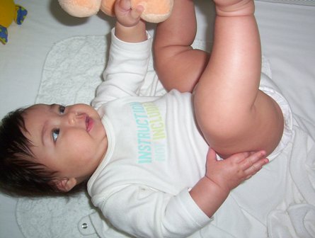 grabbing them. This caused her to move around while on her tummy. She could easily use her arms, crossing one hand