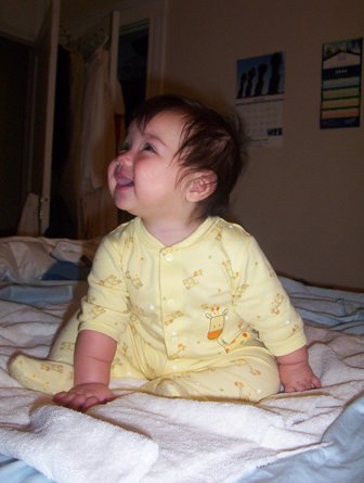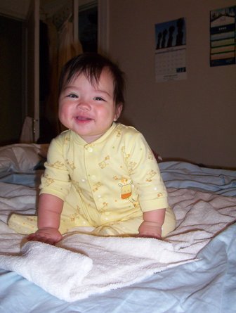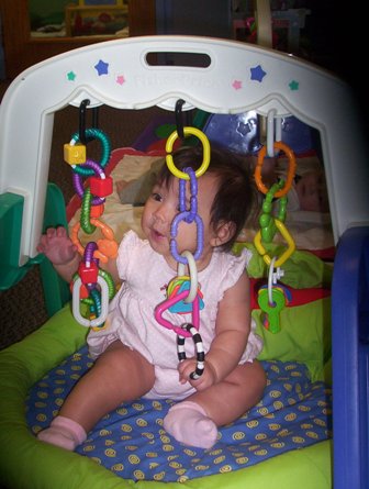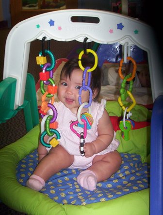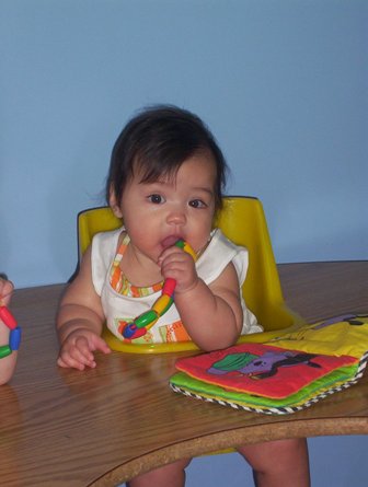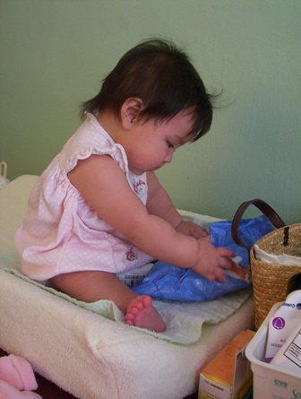 August 14: Aurora is getting much better at sitting and reaching out to grab things that she wants (and getting the
