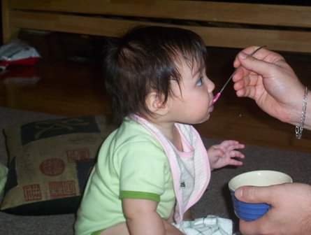 August 17: Trying rice cereal again...this time, more gets into Aurora's mouth than on her bib!