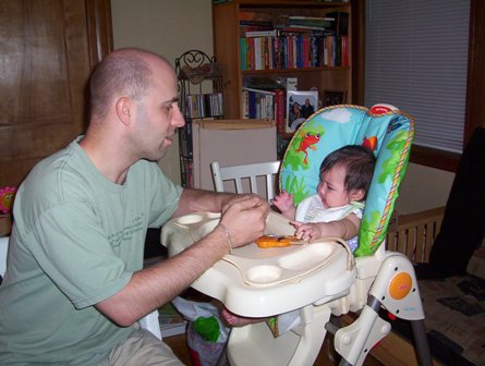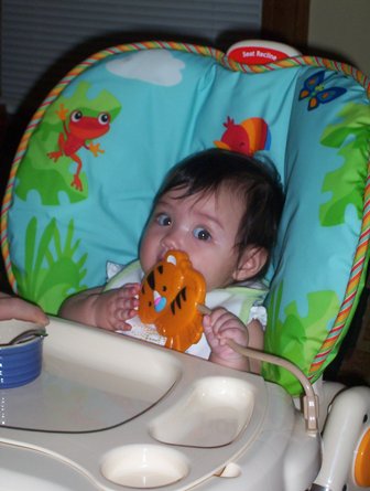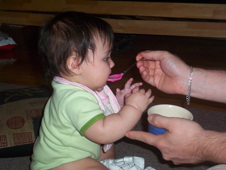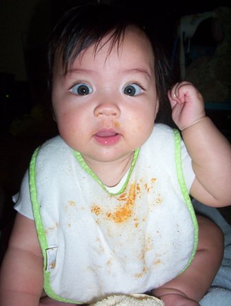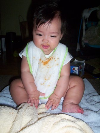 August 22: Aurora has progressed from rice cereal to sweet potatoes.