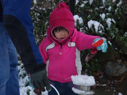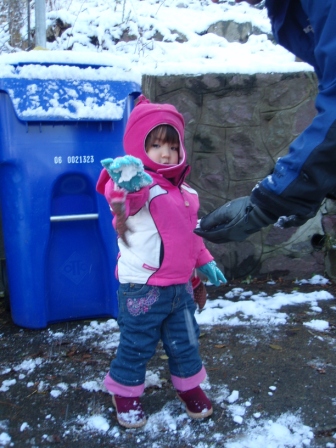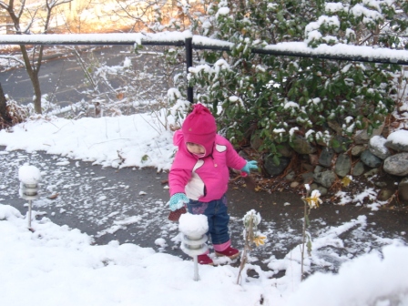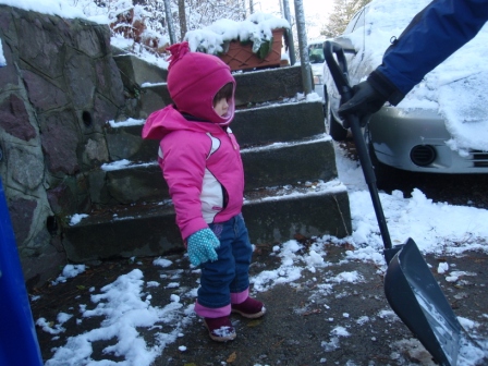 Aurora enjoyed shoveling off the solar lights, but refused to help us with the walkway.