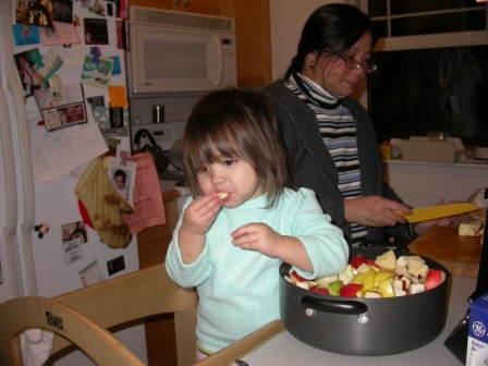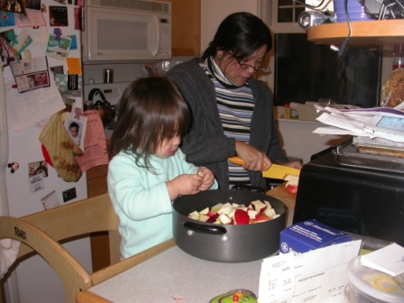 December 12, 2009: Aurora is (finally!) feeling better and helps Kathy prepare apples for applesauce.