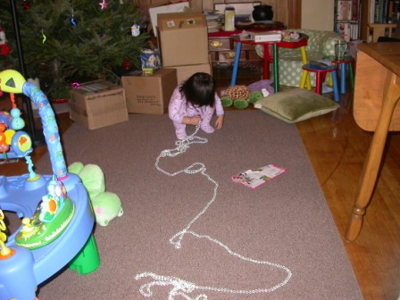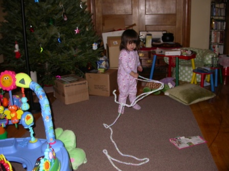 Aurora discovers the joy of playing with a long garland of plastic beads.