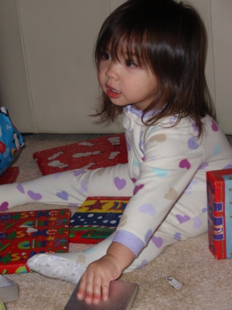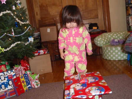 She first starts to make a pile of her presents, then sets to ripping open the packages!