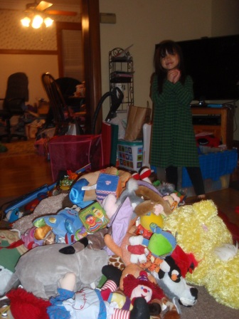 living room. As you can see, she owns enough stuffed animals to fill multiple toy boxes.