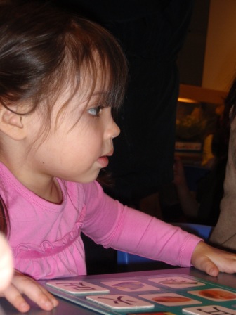 She loves the new exhibit, which is set up like a classroom. Here she is playing Chinese Bingo, and showing