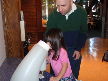 My scientist-in-training! She looked at mold, dust, and snake skin under the microscope.
