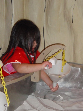 Peep's World, with water and sand tables, is full of things to do. Aurora always insists on putting