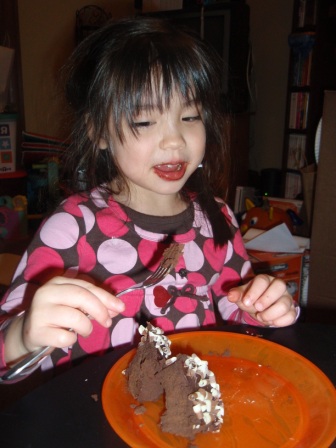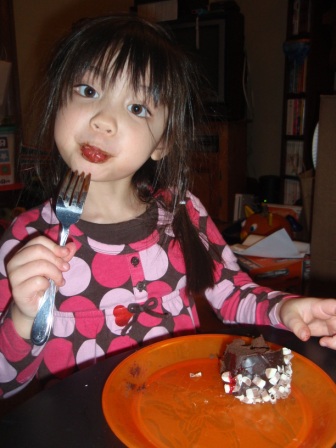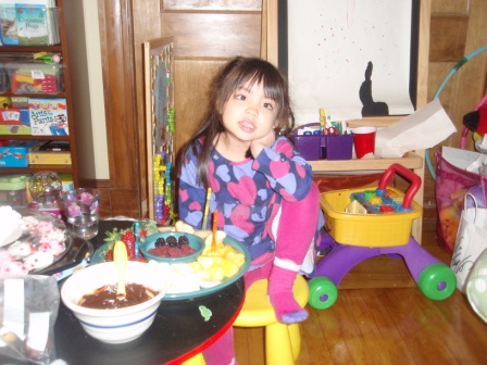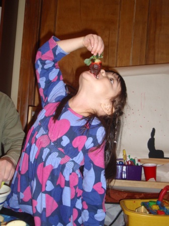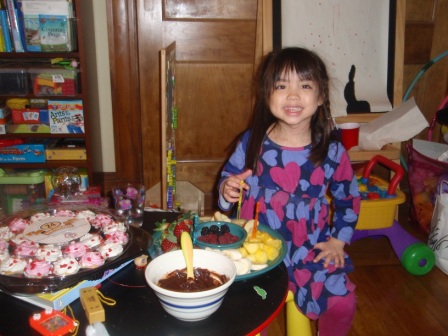 there's a special treat for dinner...chocolate fondue with lots of fruit! Aurora really