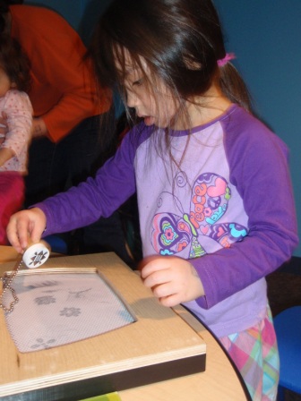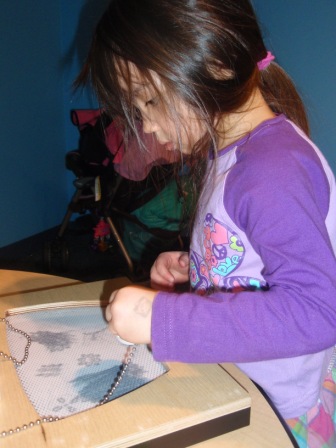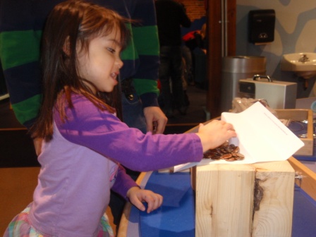 Checking out the new Native American exhibit. Aurora is stamping