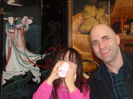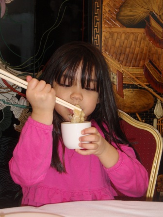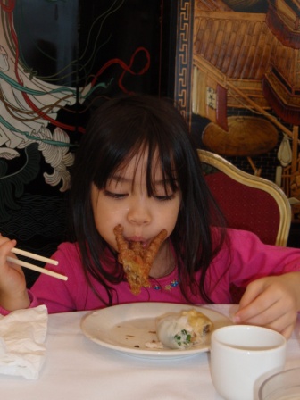 Once inside the restaurant, she enjoys using her chopsticks to eat dumplings and chicken feet.