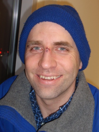 Jon shows off his newly injured nose. He had a run-in with a dumpster at work that day.