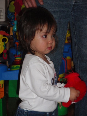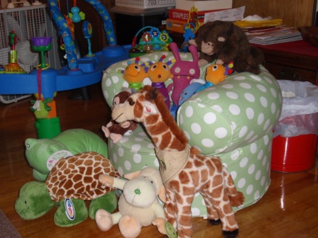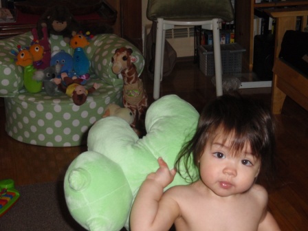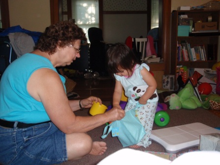 July 7, 2009: Aurora finds the pile of stuffed animals left by Grandma. She promptly runs over and