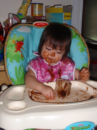 July 16, 2009: I am not sure where the apple-prune puree ends and Aurora begins! She is still trying to master