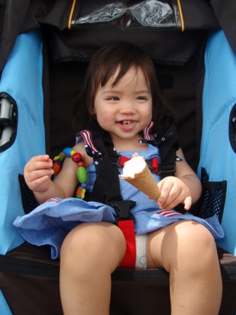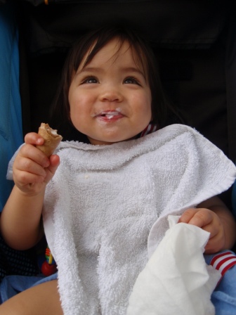 first encounter with a vanilla ice cream cone - good thing she has two parents who shared their cones with her!