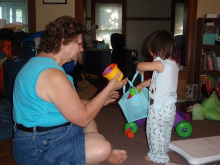 July 2, 2009: Aurora digs into a box full of goodies from the Zaleskys (Grandma, Anthony, and Chris and Lisa)