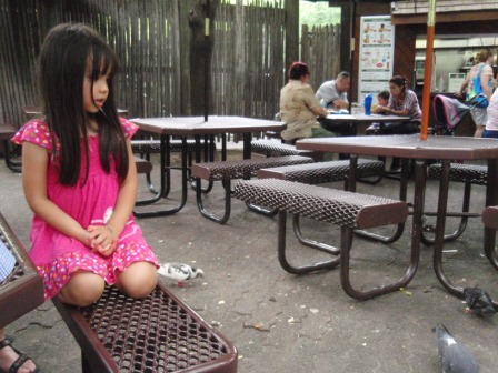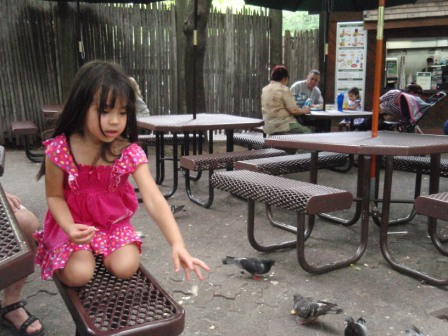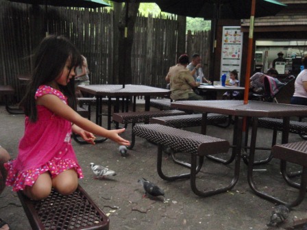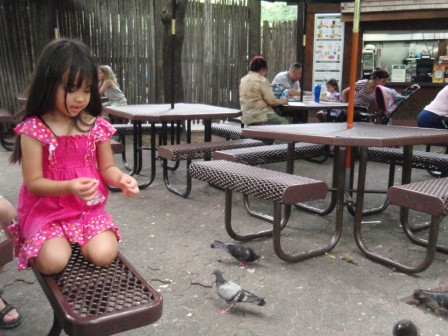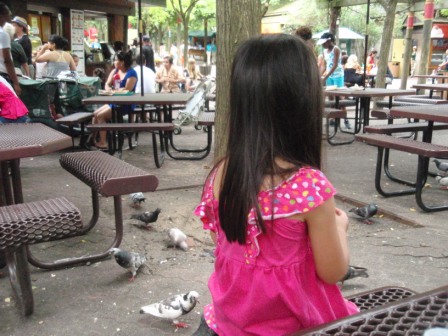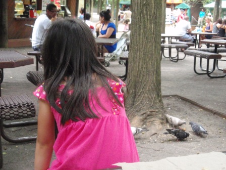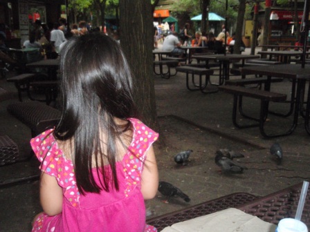 Lunch break! Aurora discovers that NYC pigeons are not shy about approaching people