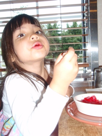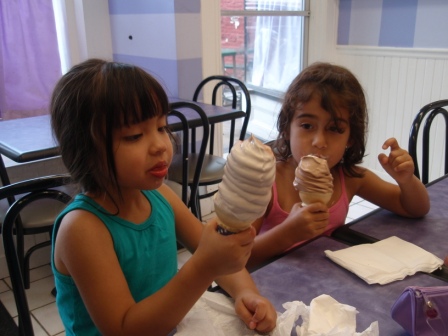 At Truly Yogurt, Aurora and Saavedra get kiddie cones that are as big as their heads!