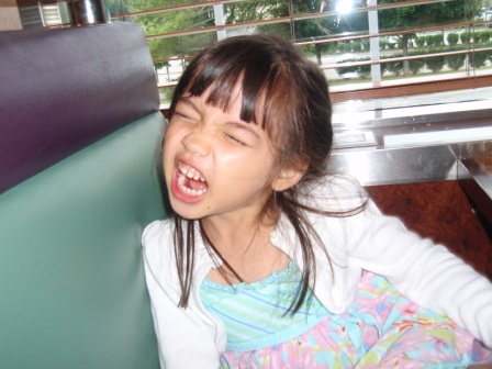 her with "tongue thrust" or an immature swallow (she pushes her tongue against the back