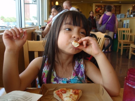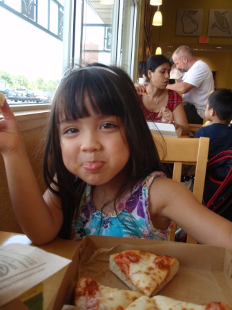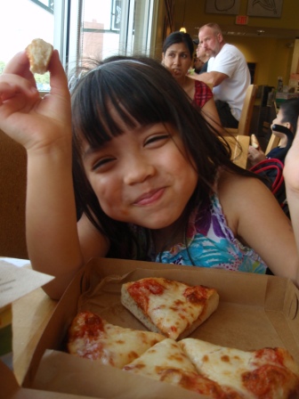 lunch out. Here she is enjoying a pizza at Whole Foods.