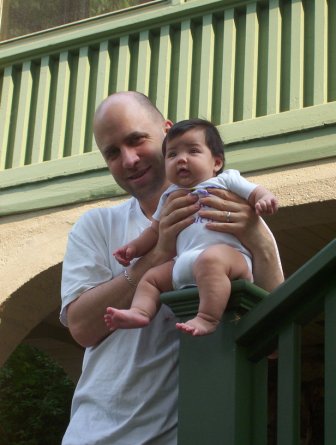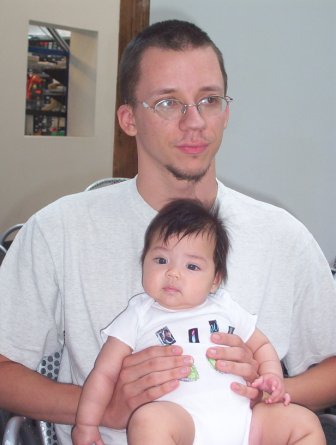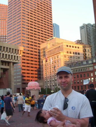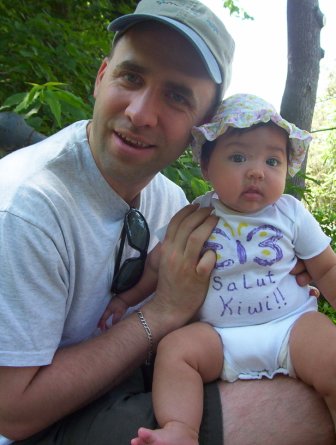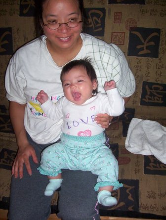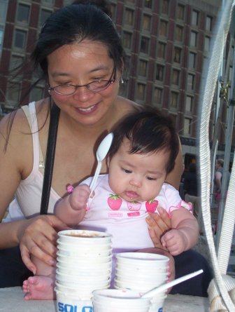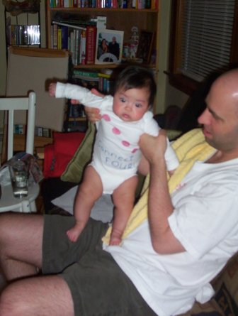 June 1: Wai Pao gets one last hug with Aurora before we leave Yorktown to return to Boston. Aurora's onesie is a hit with