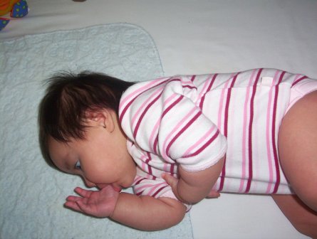 balance when she is on her left side, and end up on her tummy, which makes her mad. When she is awake, she