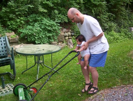 Cuddle time with Daddy, before going to explore outside. Aurora even helps Daddy pretend to mow the lawn!