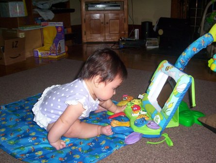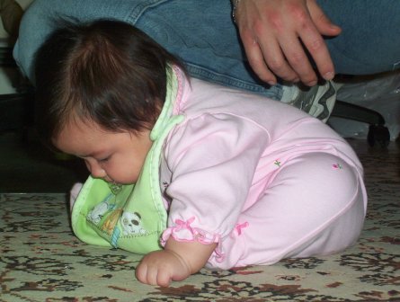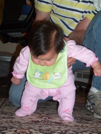 as are her legs. Aurora prefers to practice standing up over tummy time. In her crib, she has begun to move around