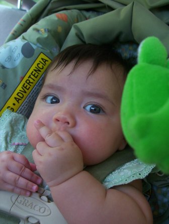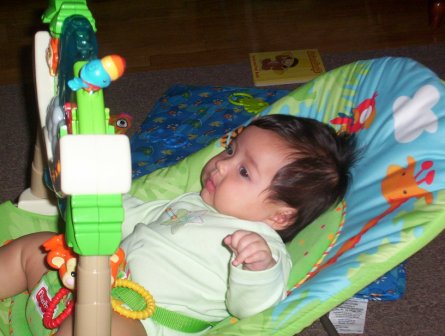 June 19: Enjoying the bouncy chair. She really reaches out to touch the animals now.