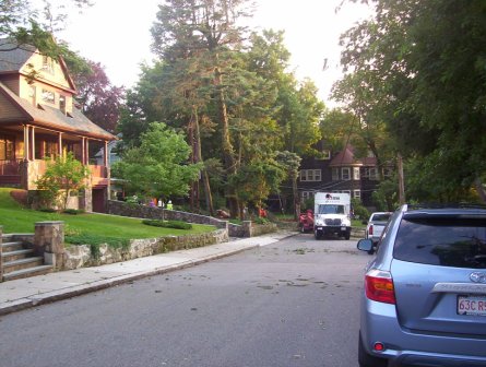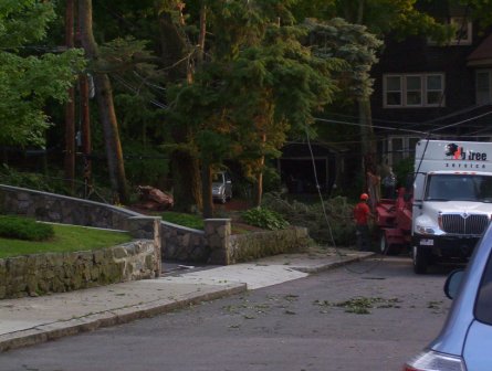 Further down the street, more tree branches took out another set of power lines. We watched the tree and NStar people work