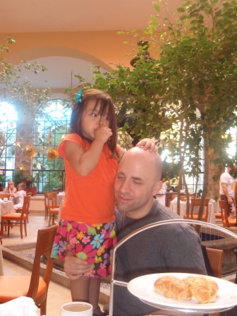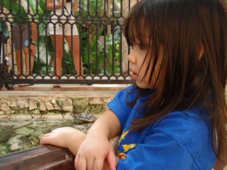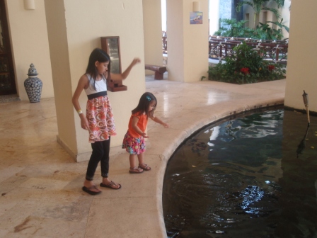 Feeding the fish in the lobby. Aurora is enjoying her third lollipop